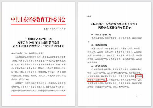 本网讯(教育信息中心)近日,中共山东省委教育工委印发《关于公布2023年度山东省教育系统党委(党组)网络安全工作优秀单位的通知》(鲁教工委函〔2024〕20号),学校再次获评“山东省教育系统党委(党组)网络安全工作优秀单位”。