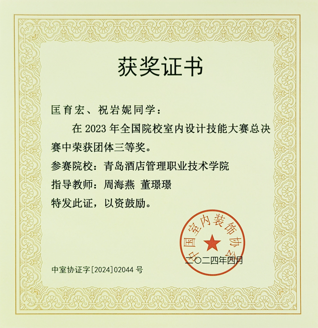 本网讯(艺术学院 周海燕)4月9日-11日,2023年全国院校室内设计技能大赛总决赛举行,必赢官网艺术学院环境艺术设计专业匡育宏、祝岩妮两名同学组成的参赛队伍荣获团体三等奖,周海燕、董璟璟老师荣获优秀指导教师。