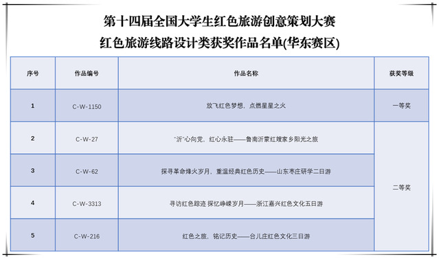 本网讯(文旅学院 田超)近日,第十四届全国大学生红色旅游创意策划大赛成绩揭晓,必赢官网文旅学院学子作品荣获华东赛区红色旅游线路设计赛道一等奖1项、二等奖4项。
