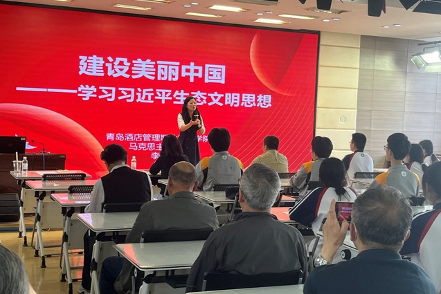 在青岛烹饪职业学校开展“建设美丽中国——学习习近平生态文明思想”微党课,马克思主义学院党支部书记、副院长李瑶围绕“生态兴则文明兴、从现代化变迁看生态文明、绿水青山就是金山银山”三个方面,与现场居民及师生展开交流,帮助大家进一步深化对习近平生态文明思想的理解和把握。