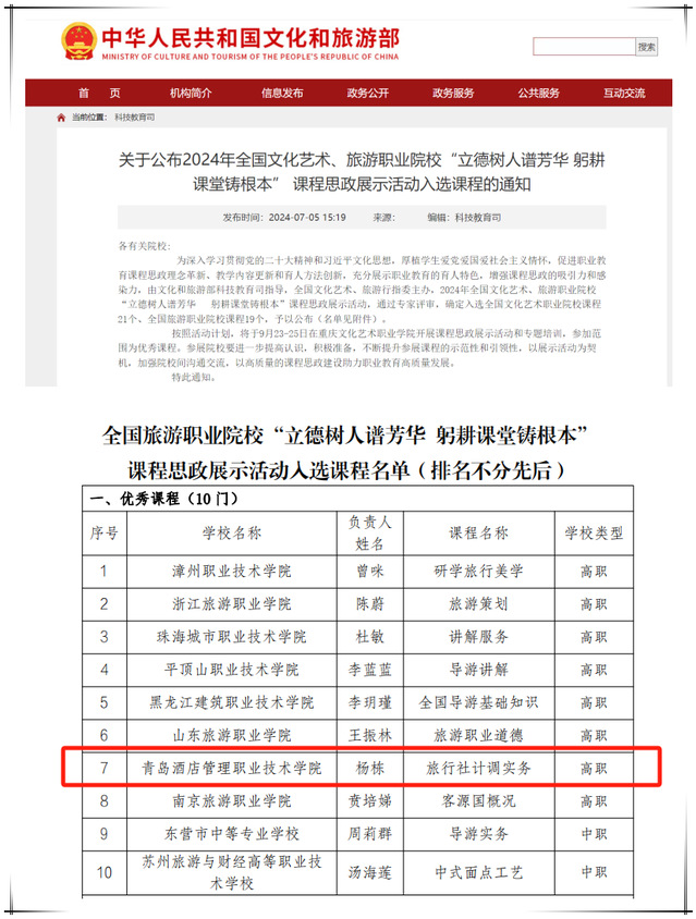 本网讯(文旅学院 杨栋)近日,文化和旅游部科技教育司发布了《关于公布2024年全国文化艺术、旅游职业院校“立德树人谱芳华 躬耕课堂铸根本”课程思政展示活动入选课程的通知》,必赢官网文旅学院杨栋老师主持的课程《旅行社计调实务》入选优秀课程。