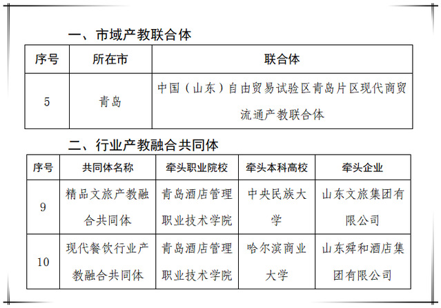 学校重视产教融合、校企合作,积极推动新形态产教融合组织建设,先后与华住酒店集团、中央民族大学等企业或高校联合牵头成立5个全国性行业产教融合共同体、1个省域行业产教融合共同体,与中国(山东)自贸区青岛片区等联合牵头成立2个市域产教联合体,多措并举健全实体化运作机制,多元主体打造校企命运共同体。此次在政、校、企多方共同努力下,历经筹备成立、机制探索、日常运作、成果提炼、经验总结、遴选申报,中国(山东)自由贸易试验区青岛片区现代商贸流通产教联合体入选第二批省级市域产教联合体项目,全国精品文旅产教融合共同体与全国现代餐饮行业产教融合共同体入选省级行业产教融合共同体项目,初步形成一批标志性成果,产教融合组织内涵建设持续丰富。