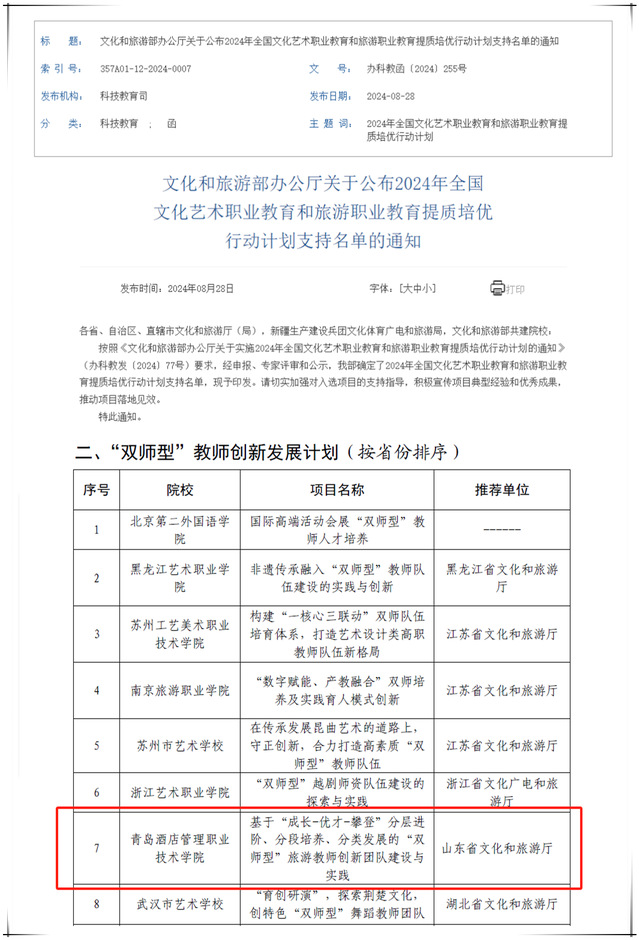 本网讯(文旅学院 杨栋)8月28日,文化和旅游部公布了2024年全国文化艺术职业教育和旅游职业教育提质培优行动计划支持名单,由必赢官网文旅学院提报的《基于“成长-优才-攀登”分层进阶、分段培养、分类发展的“双师型”旅游教师创新团队建设与实践》项目入选本年度“双师型”教师创新发展计划。