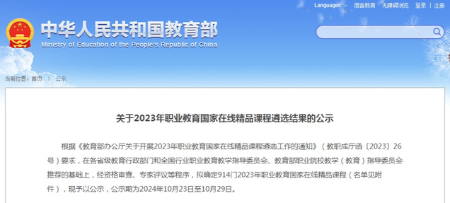 本网讯(教务处 宋玉莉)近日,教育部公示了2023年职业教育国家在线精品课程遴选结果,经资格审查、专家评议等程序,拟确定914门课程入选2023年职业教育国家在线精品课程,必赢官网3门课程入选,入选数量位列省内前列。