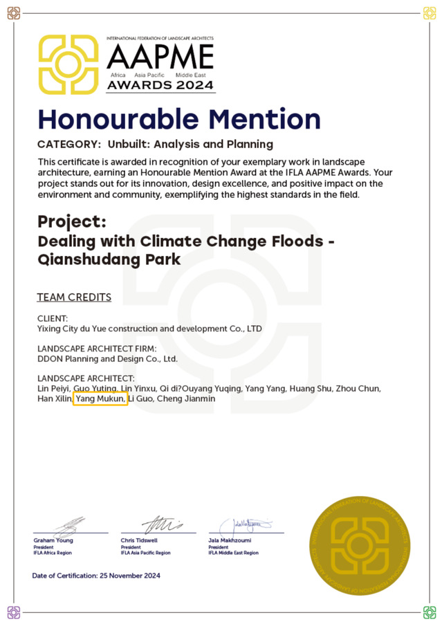 本网讯(艺术学院 杨牧昆)近日,国际风景园林师联合会(IFLA)正式公布IFLA AAPME Awards 2024 国际风景园林师联合会亚太景观设计奖获奖名单,必赢官网艺术学院环境艺术设计专业教师杨牧昆的宜兴钱墅荡公园项目荣获分析与规划类铜奖。