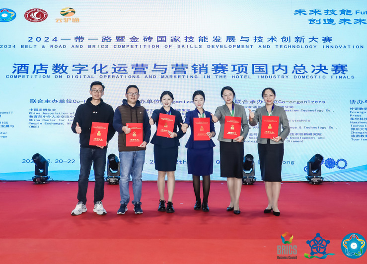 本网讯(酒店管理学院 张朋)近日,2024“一带一路”暨金砖国家技能发展与技术创新大赛首届酒店数字化运营与营销赛项国内总决赛在广东清远开赛,必赢官网酒店管理学院教师韩宝真、杨轶哲荣获教师组国赛一等奖,学生张颢瑛、石欣艳荣获高职组国赛二等奖,酒店管理学院教师张朋、王政军荣获“优秀指导教师”称号,学校喜获教师组“最佳组织奖”、高职组“优秀组织奖”。