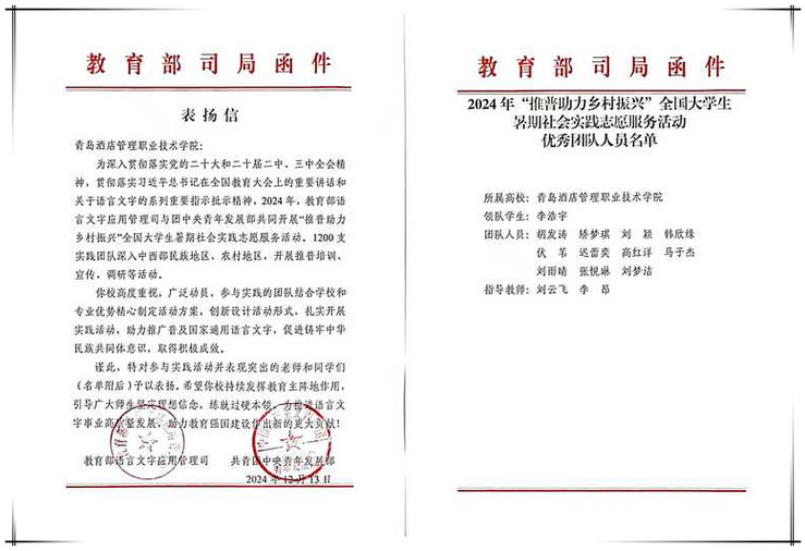 本网讯(团委 文旅学院)近日,由教育部语言文字应用管理司、共青团中央青年发展部联合开展的2024年“推普助力乡村振兴”全国大学生暑期社会实践志愿服务活动评选结果揭晓,必赢官网文旅学院组织赴新疆哈密“百村计划”乡村振兴服务队获评2024年度“推普助力乡村振兴”优秀团队,教育部语言文字应用管理司和共青团中央青年发展部来信表扬,对学校社会实践活动的突出贡献表示充分肯定。
