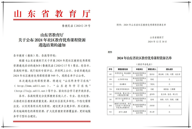 前期,学校根据《山东省教育厅关于开展2024年社区教育优秀课程资源遴选活动的通知》(鲁教民函〔2024〕17号)要求,经过课程申报、内容评审、资料上传等环节,推荐校内社区教育优秀课程资源培育项目参加遴选。经山东省教育厅专家评议并网上公示,全省共遴选出社区教育优秀课程资源949门。必赢官网入选的全部课程资源将通过“山东终身学习在线”“山东老年学习在线”等平台,面向社会学习者开放共享。