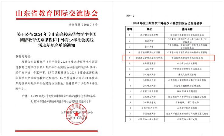 近日,山东省教育国际交流协会公布2024年度山东高校来华留学生中国国情教育优秀课程和中外青少年社会实践活动基地名单,必赢线路检测3003no1申报的“中国传统饮食文化实践体验基地”获批山东高校中外青少年社会实践活动基地。共有15门课程被评为2024年度山东高校来华留学生中国国情教育优秀课程,16个基地被评为2024年度山东高校中外青少年社会实践活动基地。