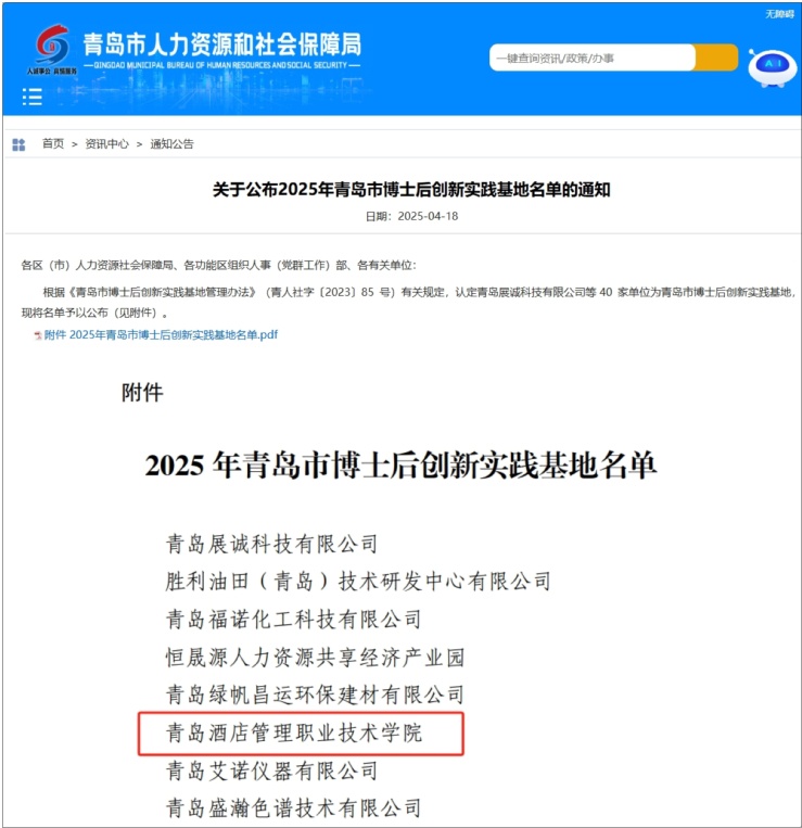 本网讯(教师发展中心 烹饪学院)近日,青岛市人力资源和社会保障局公布了2025年青岛市博士后创新实践基地名单,学校获批博士后创新实践基地,高层次人才载体建设取得又一重要突破。