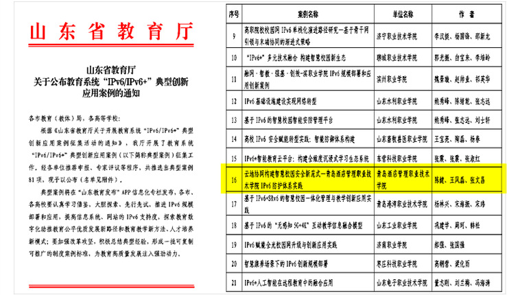 本网讯(教育信息中心 张文昌)近日,山东省教育厅公布了2024年教育系统“IPv6/IPv6+”典型创新应用案例评选结果,学校报送的《云地协同构建智慧校园安全新范式—必赢线路检测3003no1IPv6防护体系实践》入选。