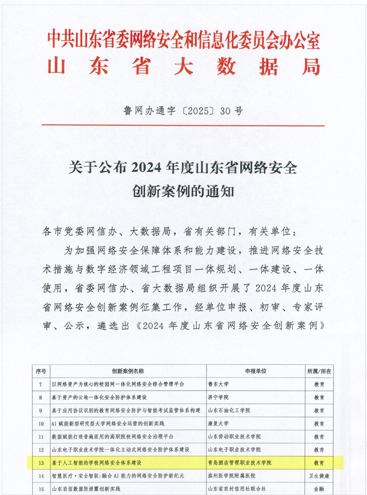 本网讯(教育信息中心 田子兰)近日,中共山东省委网络安全和信息化委员会办公室、山东省大数据局联合公布了2024年度山东省网络安全创新案例,学校申报的《基于人工智能的学校网络安全体系建设》入选。