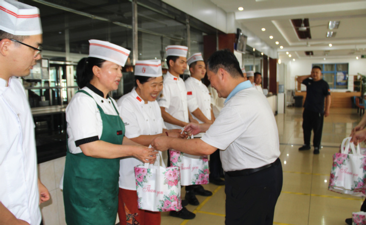刁洪斌一行先后来到大门岗亭、教职工餐厅、总务后勤绿化维护和维修施工现场,实地查看各岗位工作人员的工作环境及防暑降温措施落实情况,向在酷暑中坚守岗位、保障校园安全平稳运行的工作人员表示感谢,并送上防暑物资。刁洪斌叮嘱大家,在坚守工作岗位的同时,要结合实际情况,合理安排作息时间,做好防暑降温工作,确保安全度夏。