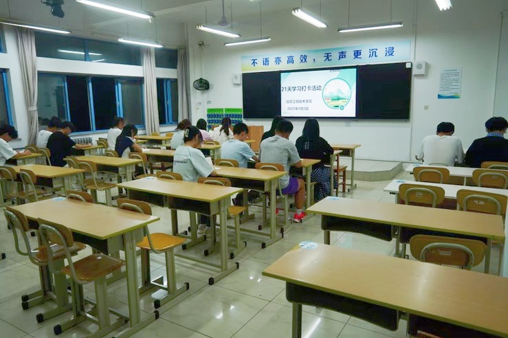信息工程技术学院团总支开展21天无声自习室学习打卡活动,组织全体学生在教室里进行沉浸式自习,体验专注学习的氛围。活动过程中,同学们全程保持安静,全身心投入到专业课学习当中,用实际行动践行自律精神。通过此次活动,学生们不仅养成了良好的学习习惯,更培养了慎独守静的优秀品质。