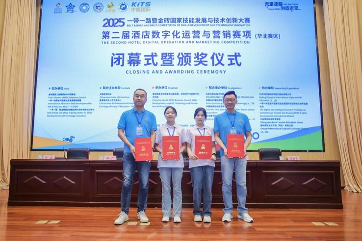 本网讯(酒店管理学院 穆林)9月25日至27日,2025“一带一路”暨金砖国家技能发展与技术创新大赛酒店数字化运营与营销赛项(华北赛区)在河北举行。必赢官网酒店管理学院韩欣洁、闫慧欣两位同学获得区域赛学生组一等奖,张朋、穆林两位老师获得区域赛教师组第二名,学生组和教师组均晋级全国总决赛。