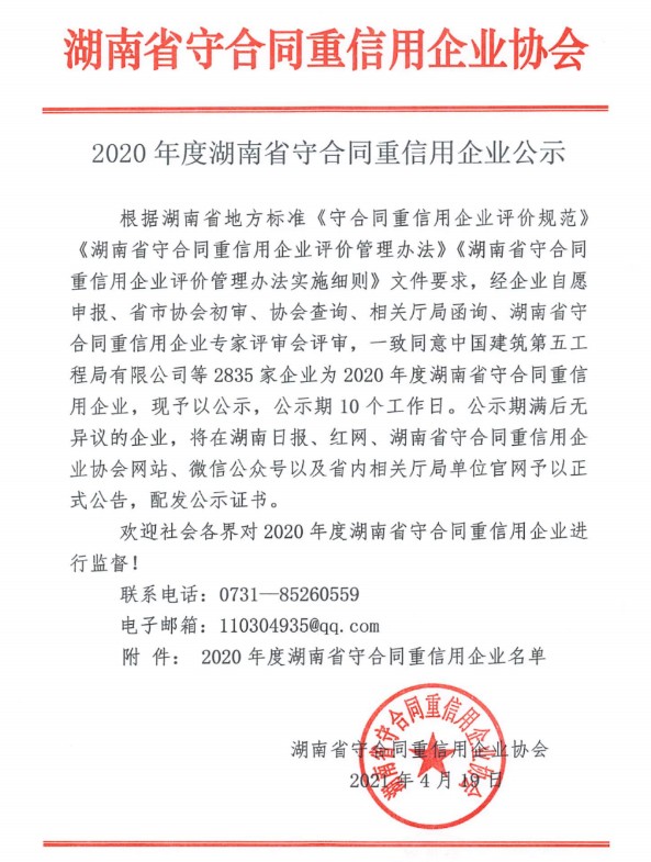经湖南省守合同重信用企业协会评审,Ky开元集团设计研究院有限公司荣获2020年度湖南省“守合同重信用企业”称号,这是设计院连续第三年获得此项荣誉。