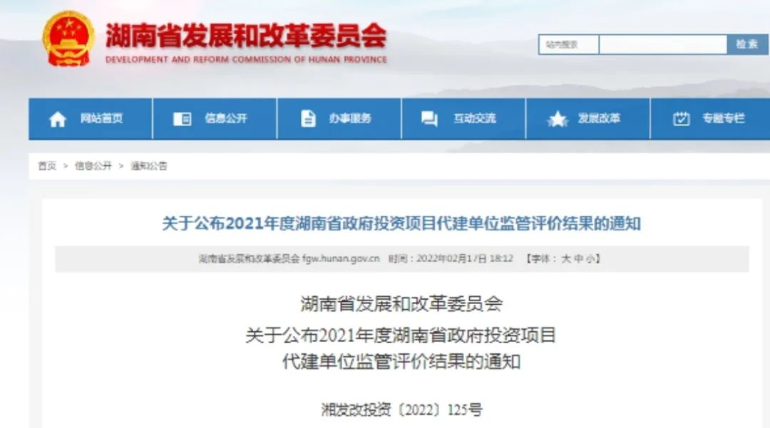 根据《湖南省政府投资项目代建单位监管评价办法》(湘发改投资[2021]163号)规定,省、市(州)、县(市、区)发展改革部门对2021年度全省代建项目及其代建单位投标行为进行了监管评价,设计院在本次监管评价中荣获2021年度湖南省政府投资项目代建单位监管评价A级。这也是设计院连续三年荣获湖南省政府投资项目代建单位监管评价A级荣誉。