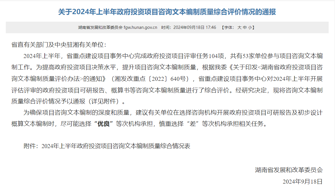 9月18日,湖南省发展和改革委员会发布《关于2024年上半年政府投资项目咨询文本编制质量综合评价情况的通报》,2024年上半年,省重点建设项目事务中心完成政府投资项目评审任务104项,共有53家单位参与项目咨询文本编制工作,省重点建设项目事务中心对2024年上半年开展评估评审的政府投资项目可研报告、概算书等咨询文本编制质量进行了综合评价。Ky开元集团设计研究院有限公司获评优良(排名第二)。