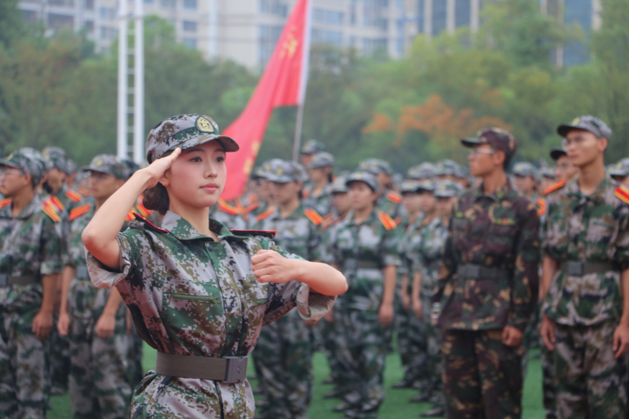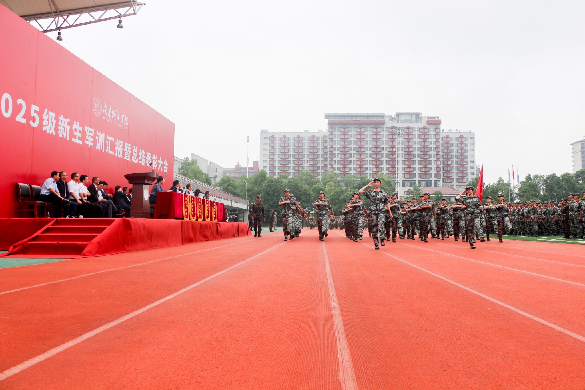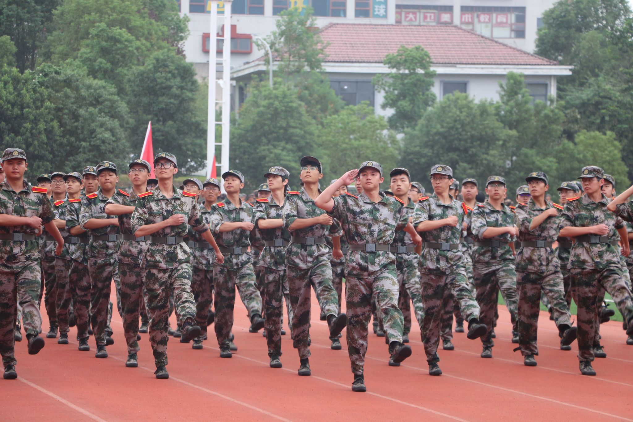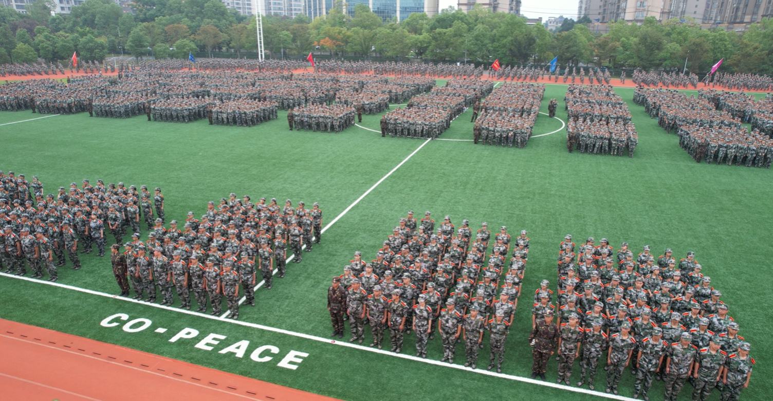 分列式进行曲响彻全场,教官分队持枪入场,眼神坚毅,步伐稳健,目光中透露出坚定与果敢。他们以豪迈的激情斗志、过硬的军事素养向全校师生展现昂扬奋发的精神风貌和青春风采。14个二级学院方阵紧随其后,身着戎装的新生喊着铿锵有力的口号,迈着整齐矫健的步伐,向全校师生展示军训成果,接受全场检阅。