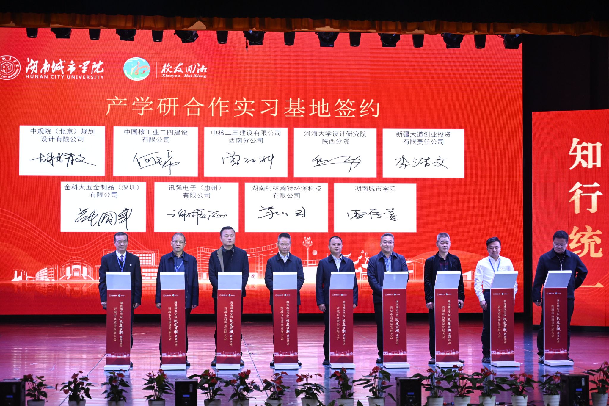 副校长谭献良、孙倩、雷存喜代表学校分别与衡阳高新开发区、祁东县人民政府等11个地方政府签订校地战略合作协议,与中核二三建设有限公司西南分公司、湖南省地质工程勘测院有限公司等10家企业签订校企就业基地协议,与中规院(北京)规划设计有限公司、中国核工业二四建设有限公司等15家企业、学校签订产教融合实习基地。