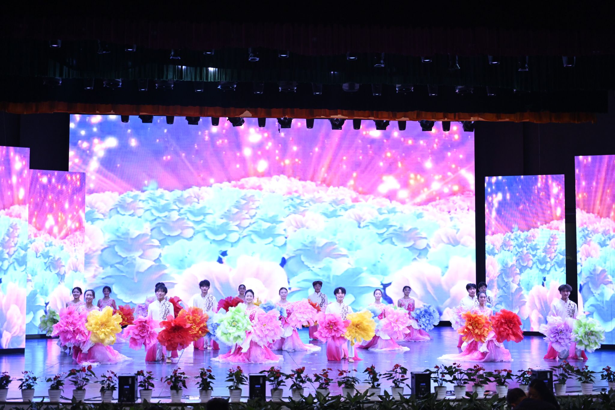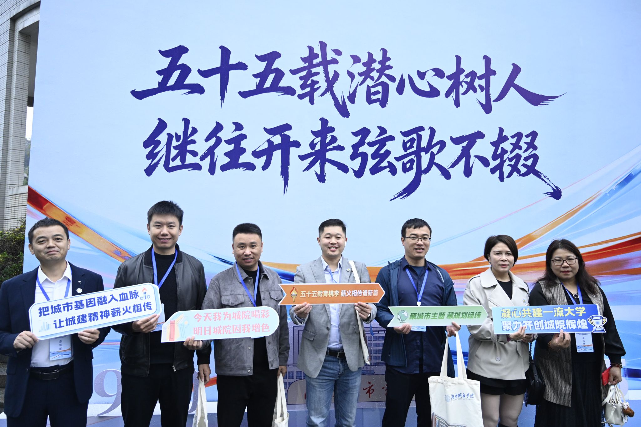 校园内彩旗高挂,巨大的宣传展板分外醒目,广大校友从大江南北回到魂牵梦萦的母校。学校音乐厅内洋溢着欢庆祥和的浓厚氛围,悠扬的音乐不绝于耳,璀璨的灯光交相辉映,大屏幕循环播放学校办学55周年主题宣传片《城市之光》,舞台两侧“五五传薪 树蕙滋兰 匠心熔铸千秋业”“久久为功 筑城强基 铁肩扛鼎万代梁”的对联异常显眼。四百余名校友、嘉宾、师生代表齐聚一堂,共话城院校友情谊,共襄城市发展蓝图。