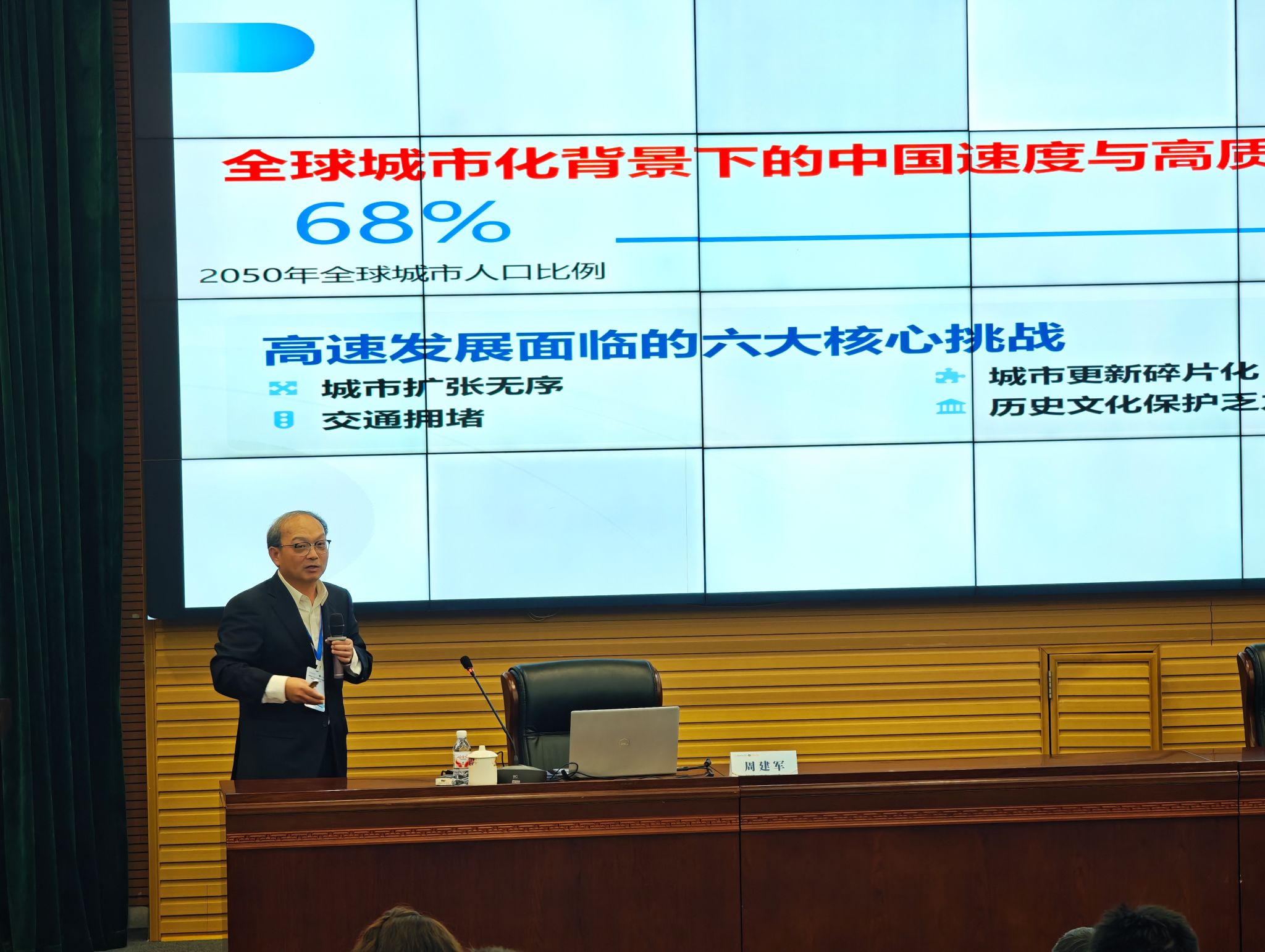 全国工程勘察设计大师、中央京津冀协同发展专家咨询委员会专家、中国环境与发展国际合作委员会特邀顾问李晓江作了题为“满足美好生活需要,应对气候变化——中央城市工作会议宏观背景解读”的主旨报告。他围绕“新时代主要矛盾与中等收入陷阱”“走向中国式现代化的美好生活时代”“气候变化应对”等三个方面系统解读了中央城市工作会议宏观背景,为与会师生带来一场兼具深度与广度的思想盛宴。