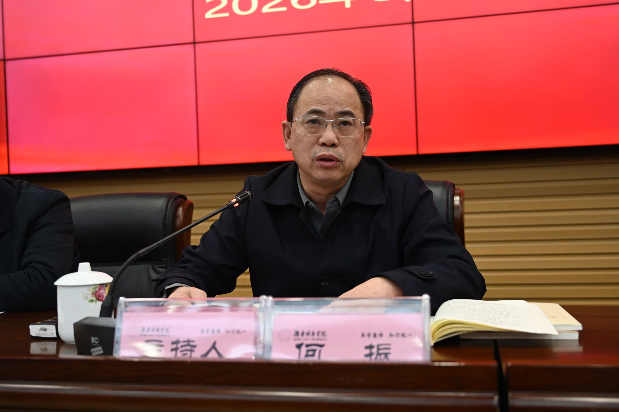 本网讯(通讯员 蔡润晨)3月19日,学校党委理论学习中心组(扩大)2026年第二次集体学习暨树立和践行正确政绩观学习教育读书班在图书馆报告厅举行,党委书记何振主持会议并讲话,全体校领导、副处级以上干部参加学习。
