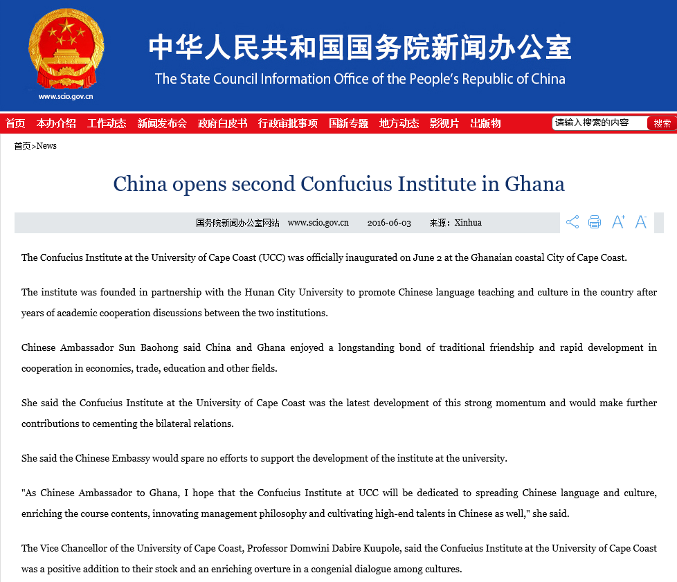 国务院新闻办公室网站、外交部网站、国家汉办网站、新华非洲网、中国侨网、中国日报、中国新闻网、中国教育新闻网、中国高校之窗、中国建设报、湖南省教育厅网站、湖南卫视、三湘都市报、湖南教育新闻网、益阳电视台、益阳日报、加纳华人论坛等二十余家网站和媒体进行专题报道或转载。