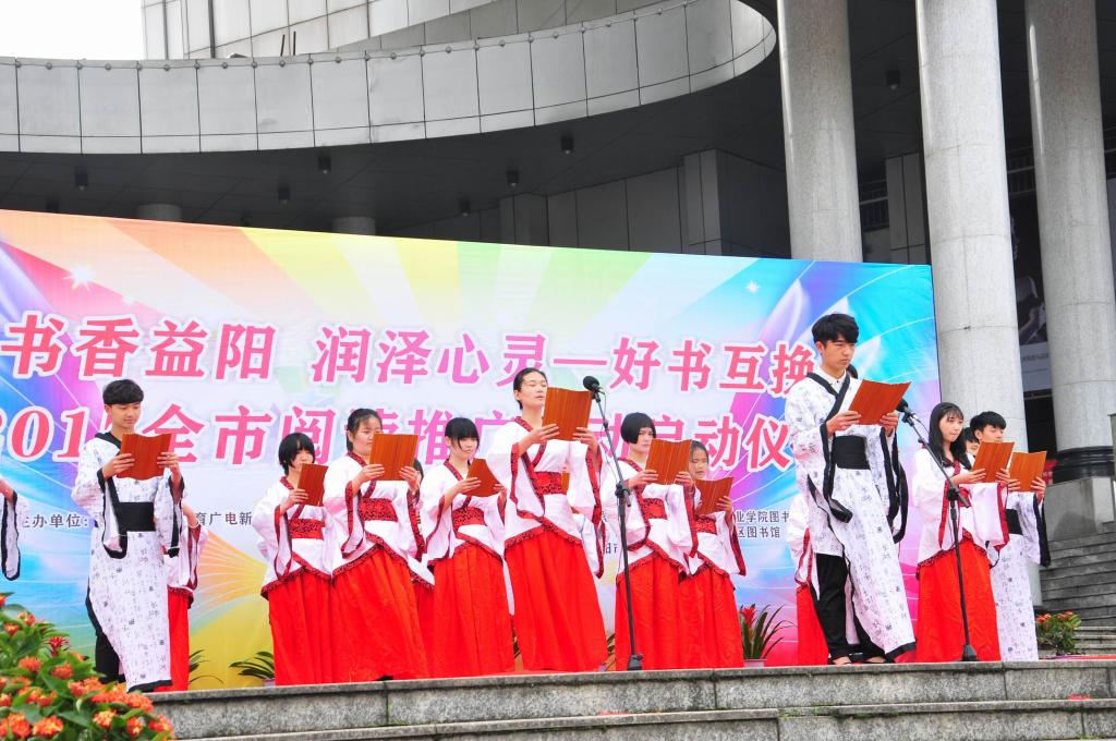 随着Ky开元学生的诗朗诵《雨巷》,启动仪式慢慢拉开帷幕。一则《道德经》,一片国学海,Ky开元人文学院学生着汉服、行汉礼的经典诵读引人入胜。随即,市图书馆馆长袁宁波宣读了“书香益阳·润泽心灵——好书互换”阅读共享倡议书,胡光华发表了“文化强市”推广全民阅读的讲话,Ky开元人文学院学生钟贝纯作为市民代表发言,胡立安宣布全市阅读推广活动启动仪式正式开始。随后,来自各高校的学生文艺表演为市民带来了活力四射的青春气息,使活动现场气氛热闹非凡。