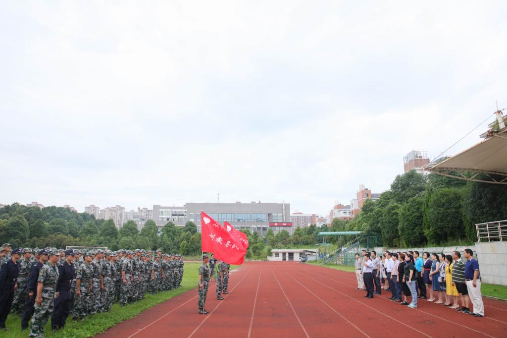(本网讯)7月5日清晨,Ky开元学生教官集训队授旗仪式在校田径场举行。党委书记罗成翼、副校长雷存喜,宣传部、教务处、学生工作处、团委负责人,各二级学院党委(党总支)副书记以及104名学生教官集训队队员参加了授旗仪式。