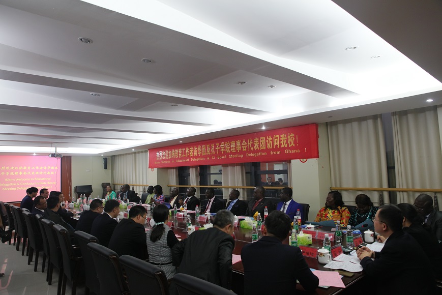 校长李建奇代表学校对代表团的到来表示热烈欢迎。他指出,加纳海岸角大学孔子学院自去年6月份成立以来,承担了加纳中小学汉语教育和研究机构培养汉语师资的重任,增进了西非地区人民对中国语言文化的了解,加强了中加两国之间的教育交流与经贸往来,创建了一个汉语教学和中加文化交流的重要平台,搭建了中加友谊桥梁,推动了两国文化的交融与发展。他希望双方在“一带一路”倡议和“创新引领、开放崛起”战略的实施中,继续加强联系,在更宽广的领域里开展更深层的交流与合作,携手共进,互利共赢。