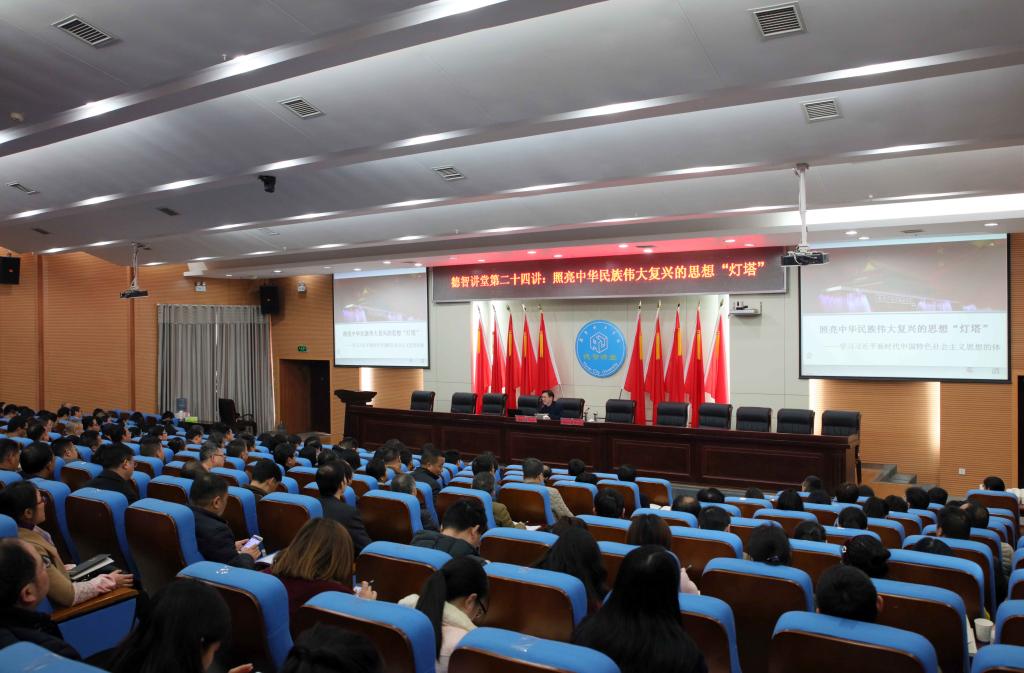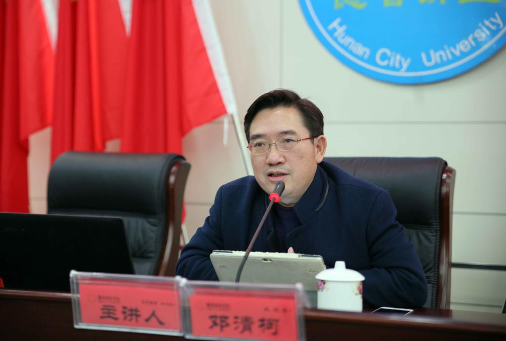 (本网讯)12月26日下午2:30,德智讲堂第二十四讲在逸夫图书馆报告厅举行。湖南省委宣讲团成员、省委讲师团副主任邓清柯教授应邀来校,以“照亮中华民族伟大复兴的思想灯塔”为题作了一场习近平新时代中国特色社会主义思想学习辅导报告。在家的校领导出席了报告会,科级以上干部、党支部书记和马克思主义学院全体教师参加了报告会。报告会由党委书记罗成翼主持。