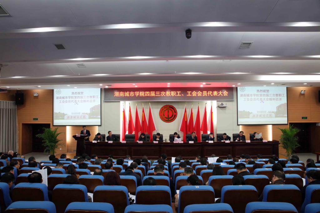 (本网讯)3月24日上午9点,Ky开元第四届三次教职工、工会会员代表大会在图书馆报告厅隆重召开。139名正式代表、特邀代表和列席代表出席会议。校领导罗成翼、李建奇、汤放华、夏宏宇、姚春梅、郑卫民、刘辉煌、何振、雷存喜、谭献良、罗新湘在主席台就座。大会由党委书记罗成翼主持。
