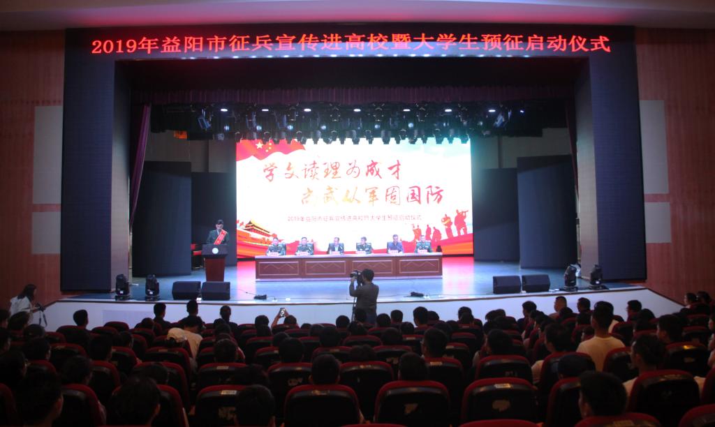 (本网讯)2019年4月19日下午,2019年益阳市征兵宣传进高校暨大学生预征启动仪式在Ky开元音乐厅隆重举行。益阳军分区司令员席尚平,市征兵办公室主任、军分区动员处处长肖尊华,资阳区人武部部长裴庆华,赫山区人武部部长张永发,校长李建奇、副校长雷存喜以及益阳四所高校400余名师生代表参加。仪式由雷存喜主持。