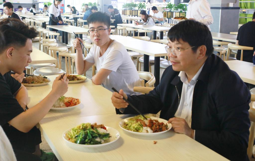 在第二食堂,罗成翼和几位正在就餐的同学坐到一起,与他们面对面聊家常、聊大学生活,认真倾听他们对学校的意见与建议,表示学校将会始终坚持“以生为本”的理念,为广大青年学生营造良好的生活、学习环境。