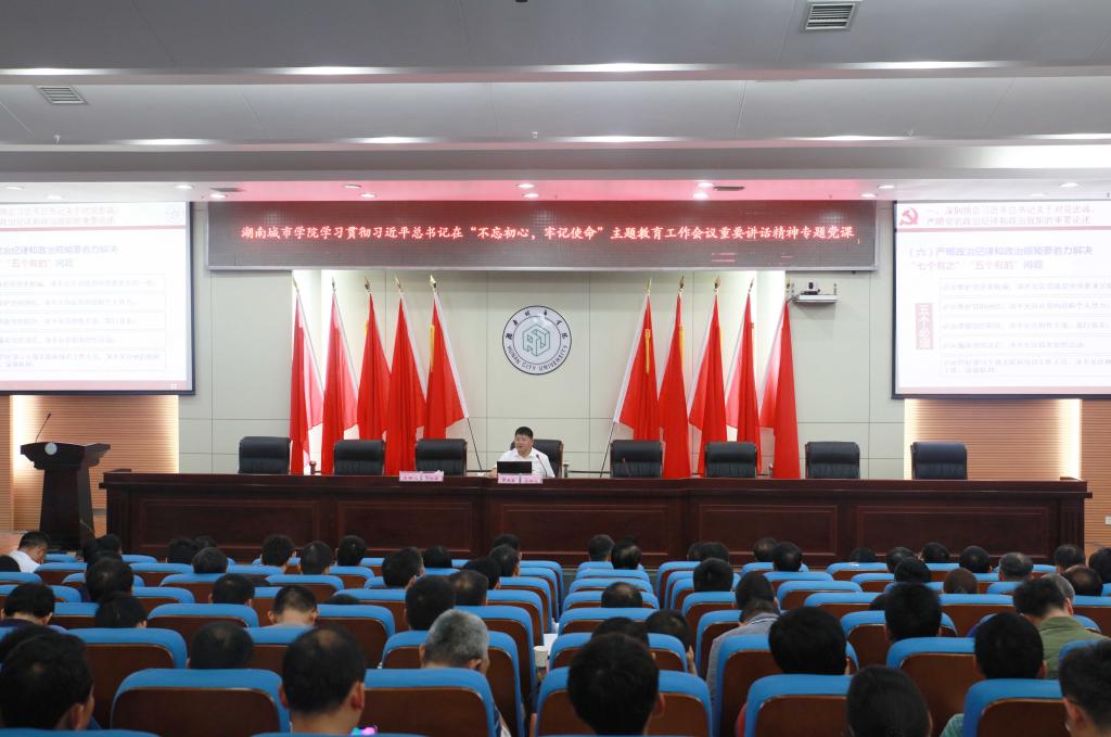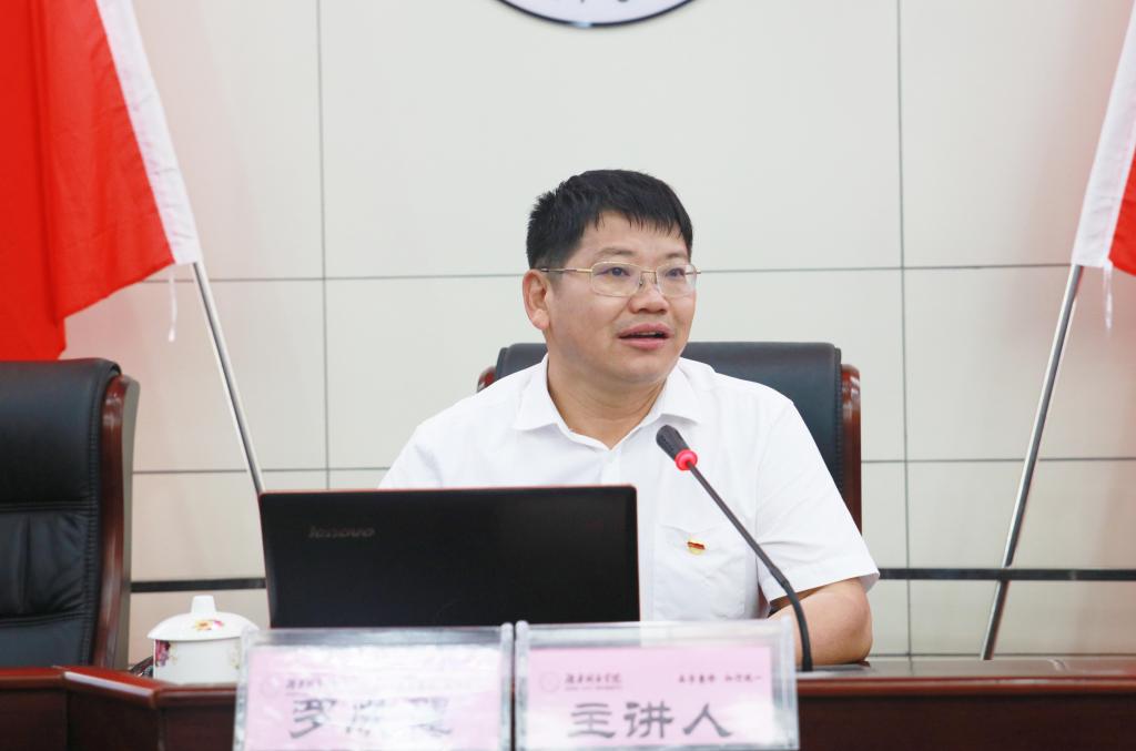 (本网讯)2019年6月9日,党委书记罗成翼在图书馆报告厅主讲了学习贯彻习近平总书记在“不忘初心,牢记使命”主题教育工作会议上重要讲话精神专题党课。在家的校领导、副处以上干部、党支部书记聆听了党课。党委副书记汤放华主持。