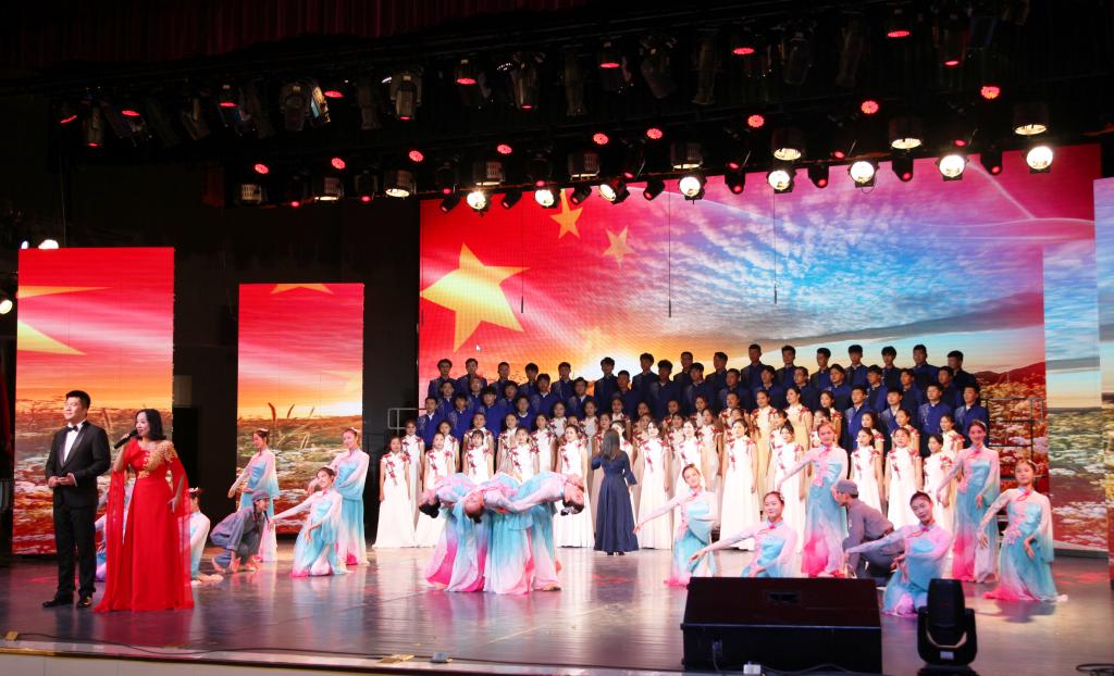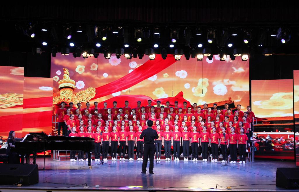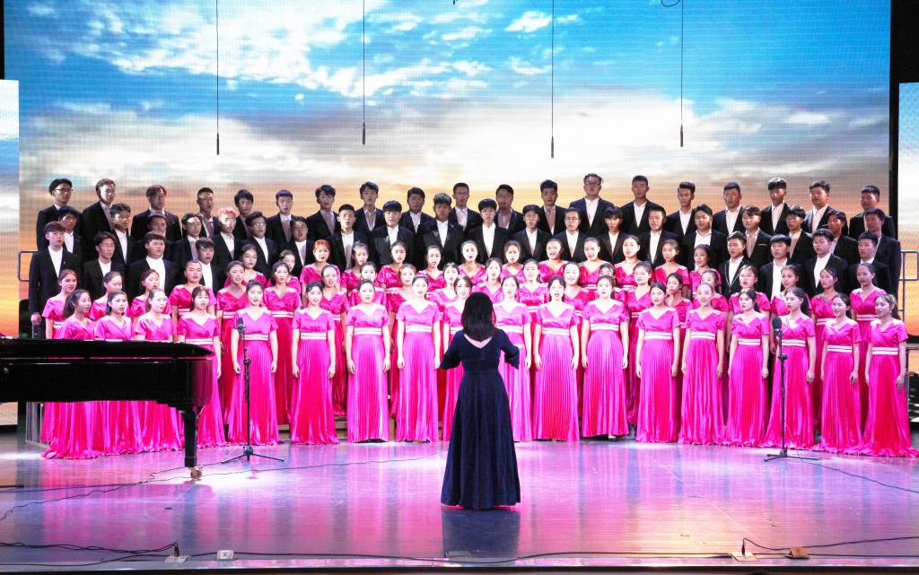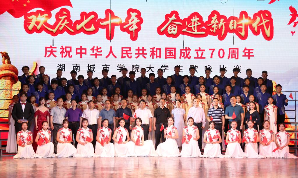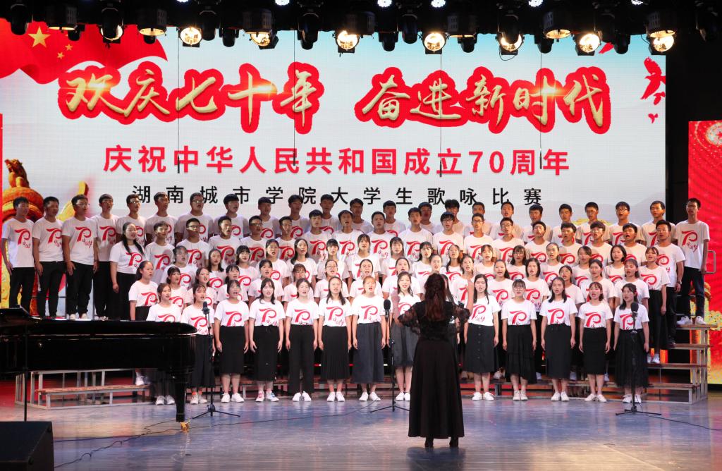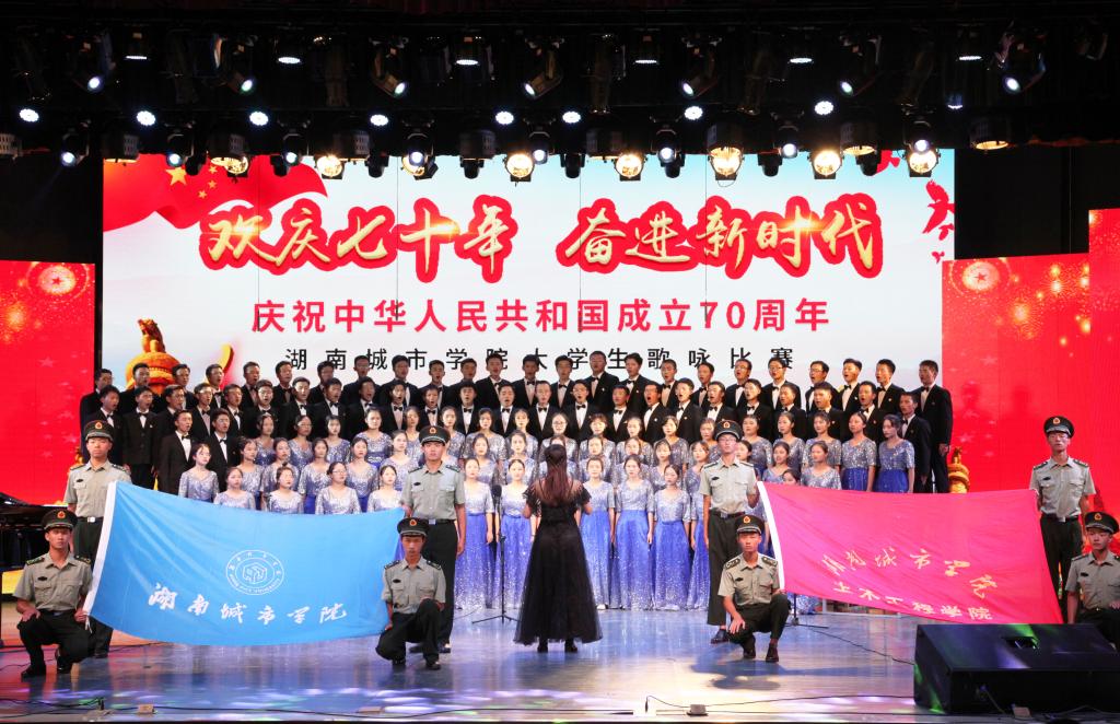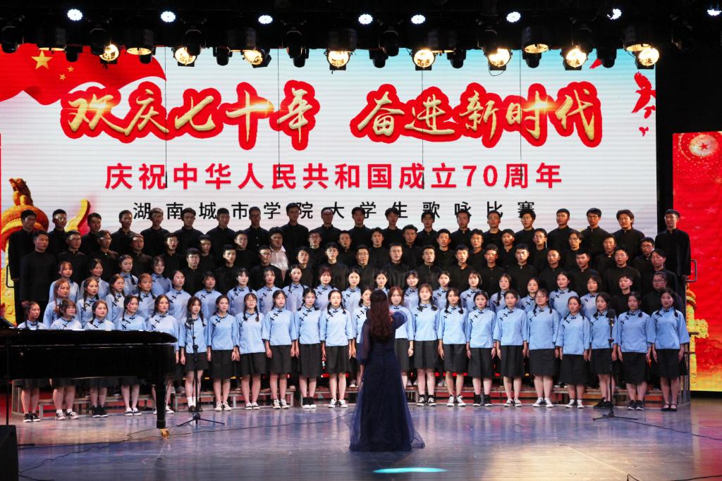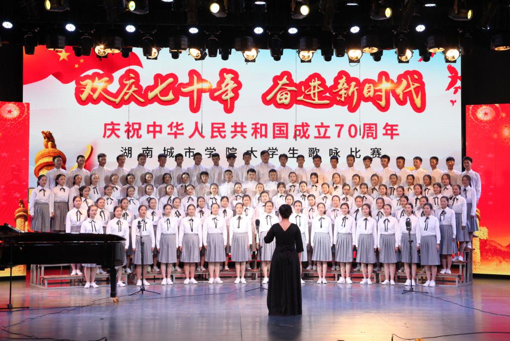 “青青会龙山下,悠悠资水之滨,八百里洞庭潮涌,伴着我们青春的足音……”艺术学院合唱队齐唱校歌拉开比赛序幕,熟悉的旋律瞬间激发了同学们爱校同心的城院情怀。随后,《保卫黄河》《爱我中华》《我爱你中国》等一曲曲动人的红色经典竞相登场,唱出了城院青年对党、对祖国的深厚感情。《南泥湾》《追寻》《在希望的田野上》《在灿烂的阳光下》《走向复兴》等一首首脍炙人口的歌曲讴歌了伟大祖国带领我们奋进新时代的丰功伟绩。学校澄音合唱团带来特别表演《我的祖国》,唱响了新中国七十载的奋发图强,歌颂了这片土地七十年的沧桑巨变。每一支参赛团队都以饱满的热情和嘹亮的歌声表达着对祖国的忠诚与热爱,现场观众心潮澎湃,掌声经久不息。最后,全场一起挥舞国旗齐唱《我和我的祖国》。