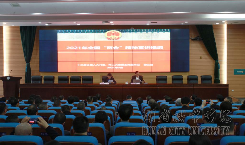 徐云波结合自己参加“两会”的见闻和感悟,从大会概况和特点、习近平总书记两会期间的重要讲话精神、党和国家领导人来团审议时的讲话精神、大会各项报告和规划纲要的主要精神以及湖南代表团及其本人履职情况等几个方面,提纲挈领、深入浅出地阐释了全国“两会”精神。他建议学校立足新发展阶段,贯彻新发展理念,构建新发展格局,将学校发展与国家命运紧密相连。抢抓乡村振兴战略全面实施机遇,积极参与县域城镇和村庄规划建设,在乡村建设中体现担当。抢抓数字经济发展历史性机遇,做优做强湖南新型智慧城市研究院等平台,在数字化发展、数字中国建设中彰显作为。抢抓“一带一路”倡议实施机遇,加强优势学科建设和人才培养,加快实现高质量发展。