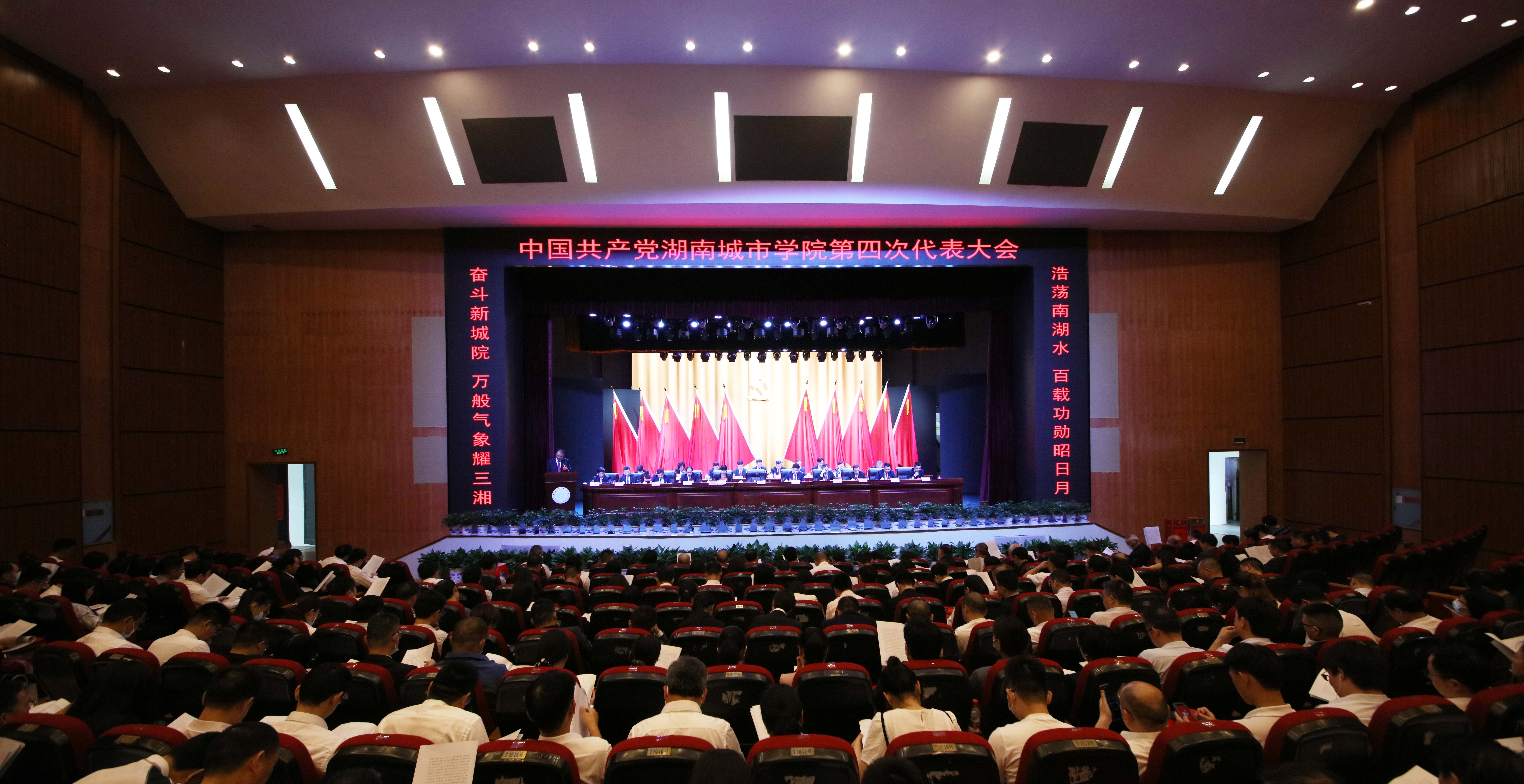 在鲜花和红旗的映衬下,会场内气氛庄严、热烈。主席台正中央悬挂着金色的党徽,10面鲜艳的红旗排列在两边。主席台两侧电子屏上打出的对联——“浩荡南湖水 百载功勋昭日月;奋斗新城院 万般气象耀三湘”分外耀眼;主席台对面“乘势而上 接续奋斗 全面开启建设湖南城市大学新征程”的巨型横幅格外醒目。