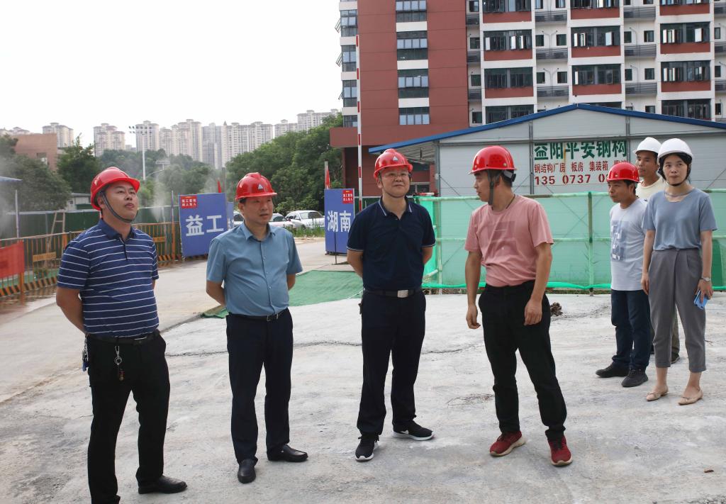 本网讯 2021年7月7日下午,校长汤放华带队赴新建学生宿舍施工现场检查指导工作。副校长谭献良,基建与后勤管理处、设计研究院有限公司、监理公司以及施工单位负责人陪同检查。