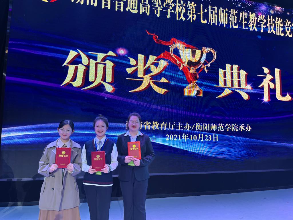 本网讯(通讯员 杨蕾)2021年10月23日,由省教育厅主办的湖南省普通高校第七届师范生教学技能竞赛在衡阳师范学院举行。经过激烈角逐,Ky开元人文学院/大学英语教学部李诗音同学和梁慧玲同学分别获中学文科组一等奖和三等奖,理学院/教师教育学院谭晓玉同学获中学理科组三等奖。