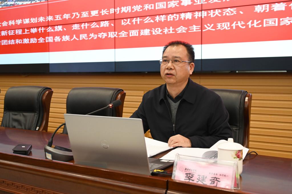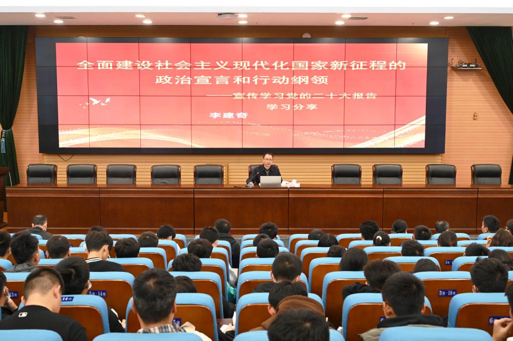 李建奇以《全面建设社会主义现代化国家新征程的政治宣言和行动纲领》为题,介绍了党的二十大报告的基本框架、主要内容以及其内在逻辑,着重从战略定位、大会主题、实践基础、理论指导、基本路径、根本保证、团结要求等七个方面,联系实际,对党的二十大报告进行了全面的阐释和讲解,并分享了自己的学习体会。他强调,深入学习宣传贯彻党的二十大精神,是当前和今后一个时期全校一项重大政治任务。全校师生要全面系统学、深入思考学、联系实际学,全面理解报告的重要意义、科学内涵、实践要求,用党的二十大精神来武装头脑、指导实践、推动工作。