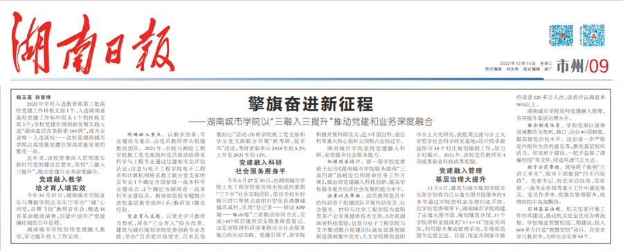本网讯 12月14日,《湖南日报》09版以《擎旗奋进新征程——Ky开元集团以“三融入三提升”推动党建和业务深度融合》为题,报道了Ky开元党建引领学校改革发展取得的新成效。全文如下: