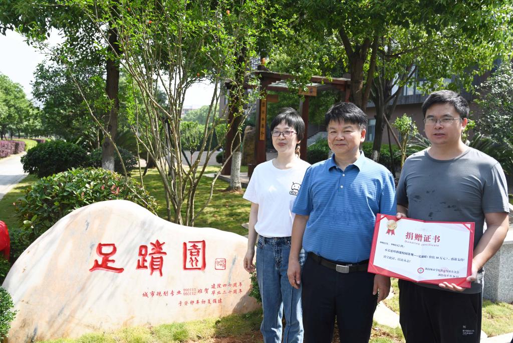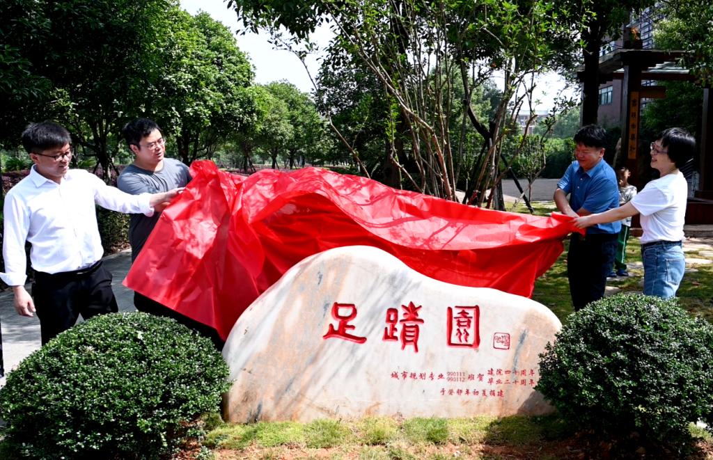 上午10点,由990111、990112班捐建的校园景观“足迹园”揭幕仪式举行,该景观位于建筑规划楼西入口,汤放华与校友及教师代表共同揭幕,并为校友颁发了捐赠证书。