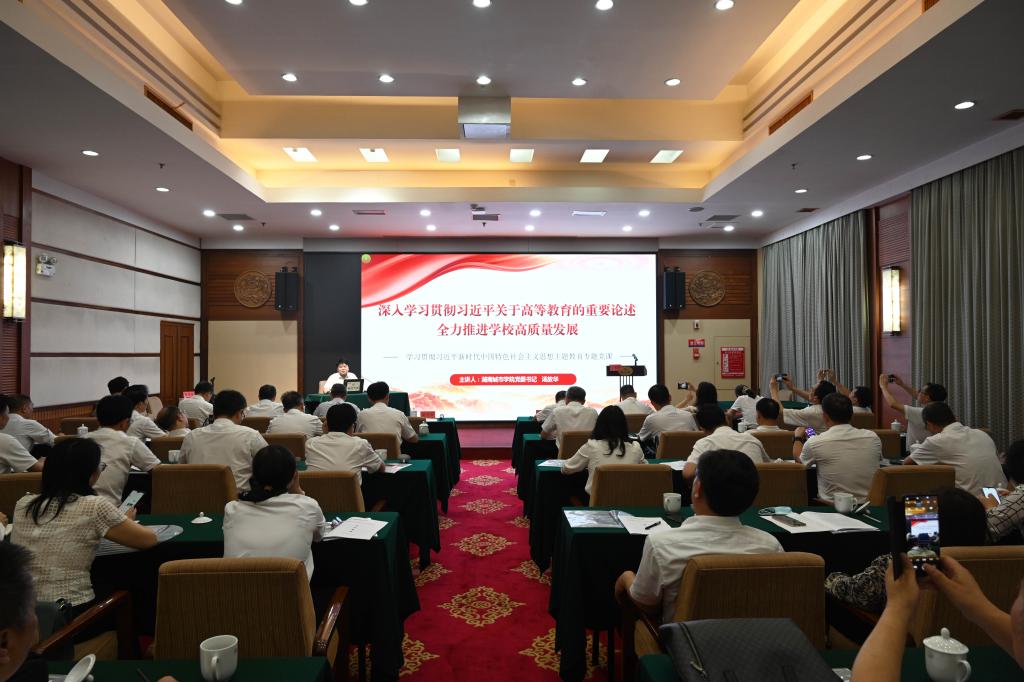下午,全体成员在韶山宾馆会议室进行了“以学增智”专题学习研讨。汤放华以《深入学习贯彻习近平关于高等教育的重要论述 全力推进学校高质量发展》为题,为大家上了一堂深刻的党课。汤放华紧密结合当前高等教育新形势和学校发展新情况,通过详实的数据对比、丰富的案例讲解,从领会精神、再学习再思考习近平总书记关于教育重要论述,审时度势、切实增强教育强国的责任感使命感和紧迫感,狠抓落实、谱写新时代新征程Ky开元集团高质量发展新篇章三个方面,阐述了学习贯彻习近平总书记关于教育的重要论述我们要做什么、怎么做的问题。