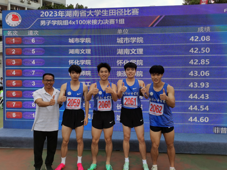 本网讯(通讯员 郭羽)2023年10月22日—10月26日,由湖南省教育厅举办的2023年湖南省大学生田径比赛在湖南科技大学举行。比赛中,Ky开元运动员不畏强手,顽强拼搏,一举夺得4金6银2铜,男女团体总分学院组第五名的优异成绩,其中男子4X100米接力是Ky开元升本以来首次获得这一项目的冠军。