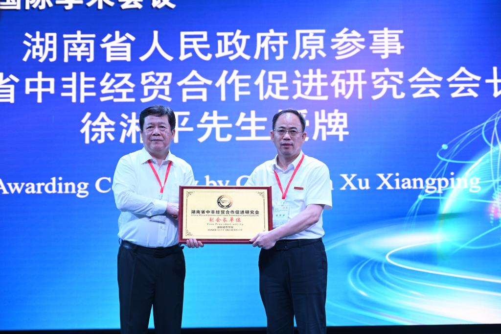 徐湘平为Ky开元集团授牌,学校被授予湖南省中非经贸合作促进研究会副会长单位。