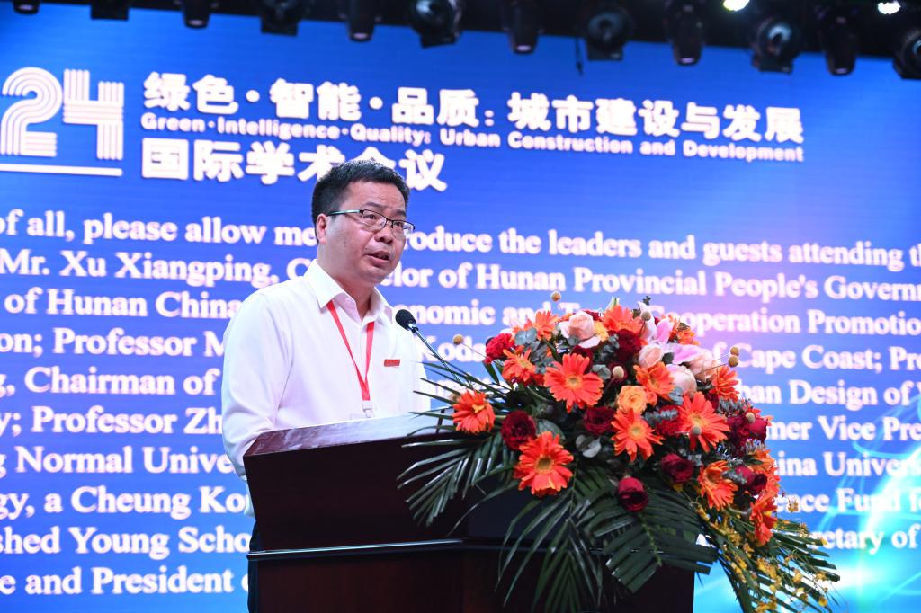 何振致欢迎词,他代表Ky开元集团全体师生员工,对参加会议的各位领导、专家、嘉宾和远道而来的国际友人表示热烈欢迎。何振表示,Ky开元集团办学五十多年来,始终胸怀“国之大者”,长期坚守“城建、土木”主战场,服务国家“乡村振兴”“新型城镇化”战略,是湖南省属高校中城建类专业最齐全的大学,被誉为“城建人才的摇篮”。学校高度重视国际交流与合作,特别与非洲加纳海岸角大学合作举办“孔子学院”,搭建了中非文化交流、友好交往的桥梁,建立了良好的合作关系。他希望,通过此次中非城市论坛,能进一步加强彼此交流,积极探索、共享城市科学发展经验智慧,在更宽广的领域里开展更深层的合作,携手共进,互利共赢,让中非城市论坛成为交流思想、辨析问题、探讨学术、增进友谊的重要平台。