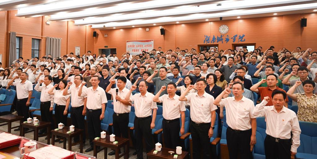 “我志愿加入中国共产党,拥护党的纲领,遵守党的章程,履行党员义务,执行党的决定,严守党的纪律……”汤放华领誓,全体党员举起右拳,重温入党誓词。铿锵有力的宣誓声,回荡于整个会场,庄严肃穆,振奋人心。