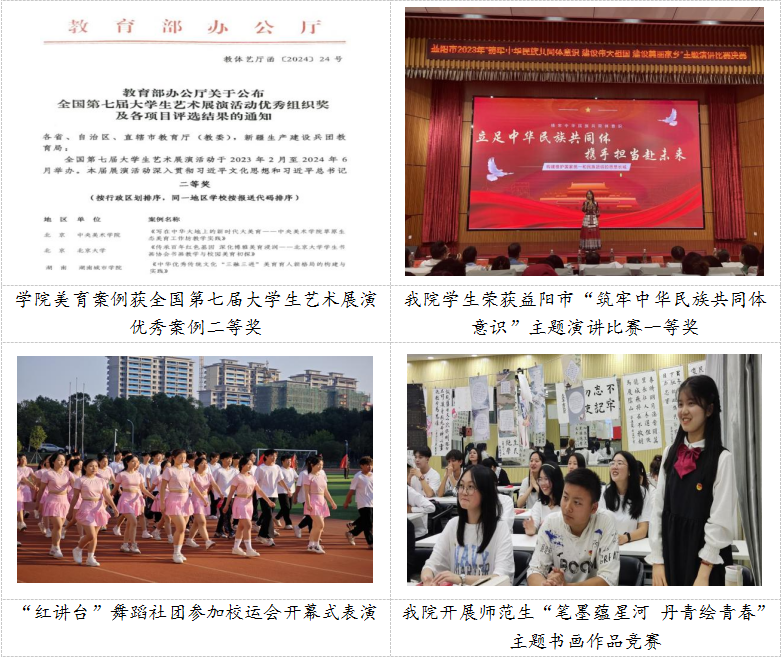 打造“周末红讲台”学生社团活动精品,围绕师范技能培养组建了演讲、书法、绘画、音乐、舞蹈、体育等学生社团,通过讲红色故事、练书法作品、演情景剧、绘制红色主题黑板报、党史教育手抄报、唱红歌等“美育浸润”社团活动,促进师范生德智体美劳全面发展。学院《中华优秀传统文化“三融三进”美育育人新格局的构建与实践》案例获得全国第七届大学生艺术展演活动高校美育改革创新优秀案例二等奖。